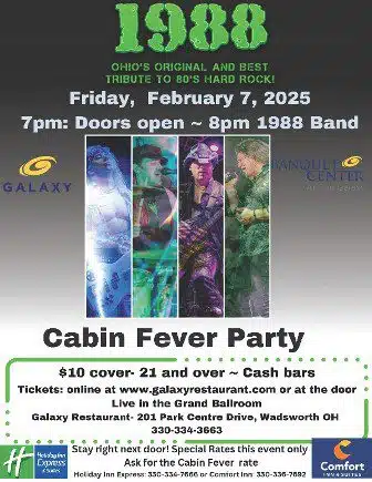 Join us for the 1988 band for the Cabin Fever party. 21 and over, cash bars, full dance floor.