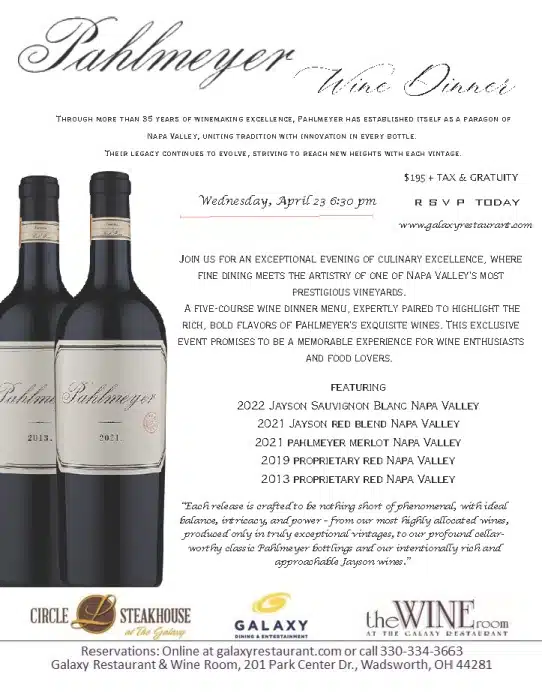 Join us for an exclusive wine dinner with Pahlmeyer Wines of Napa Valley. We will feature a five course dinner paired with Pahlmeyer wines. And the last course has a surprise, a side by side tasting of their Flagship Pahlmeyer Proprietary Red Napa from 2013, a Galaxy cellar stock and their current release from 2021.